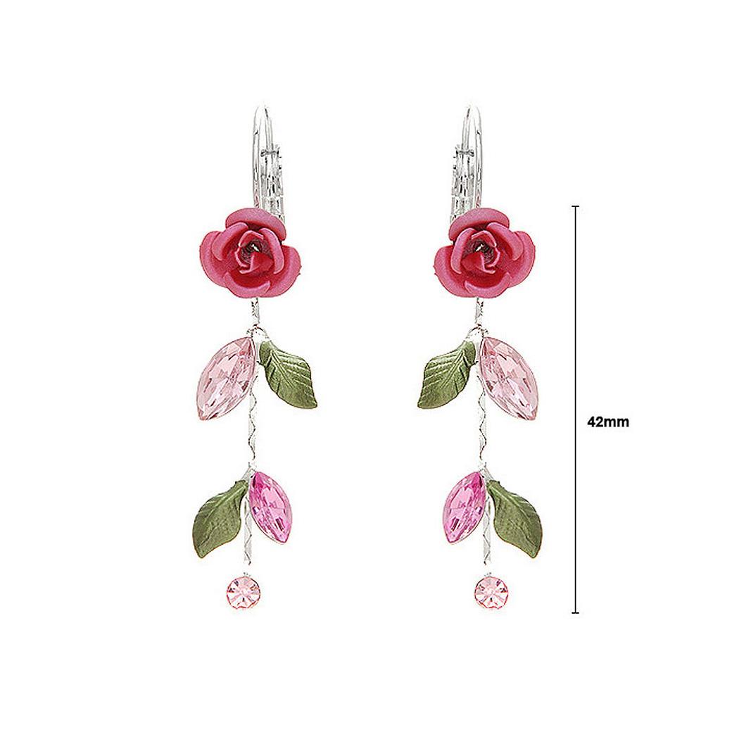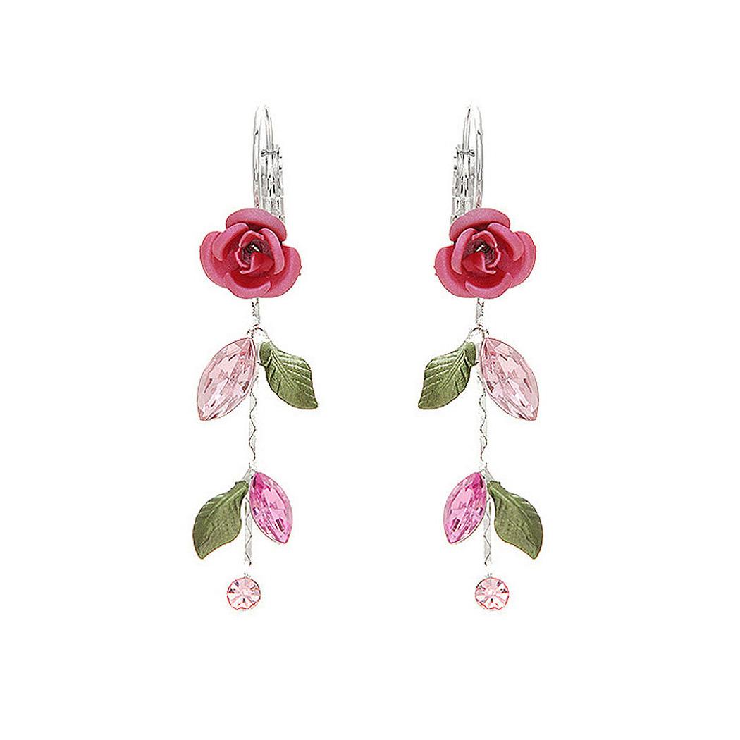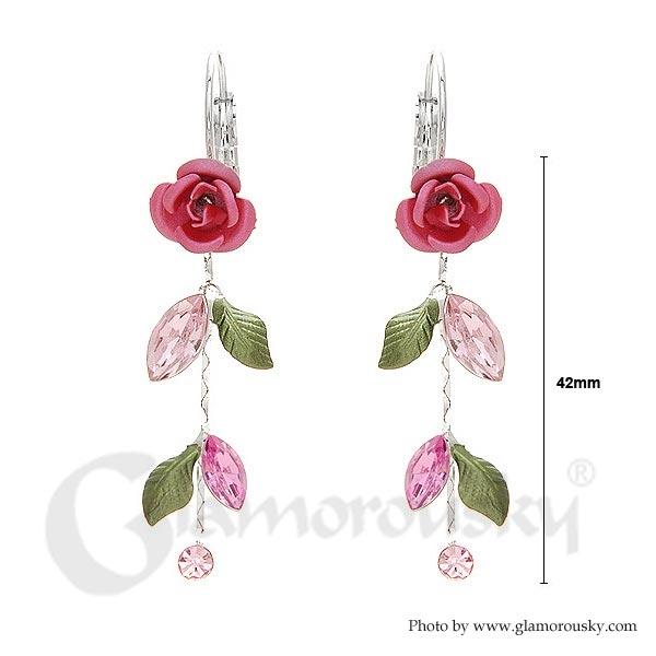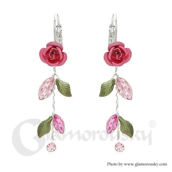 Cherry Pink Rose Earrings with Pink Austrian Crystals and Crystal Glass