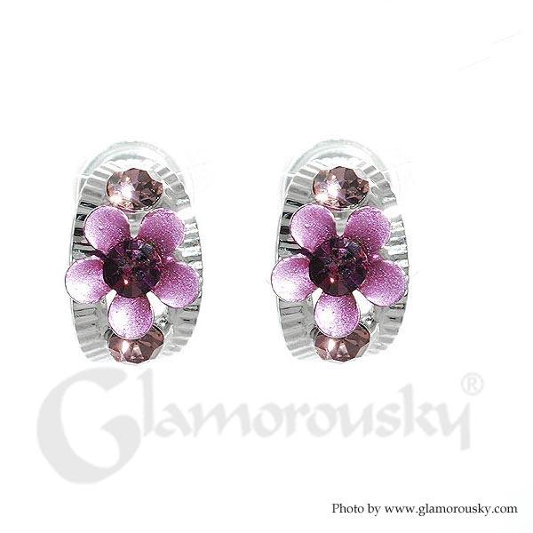 Flower on Curved Leaf Earrings with Purple Austrian Element Crystals