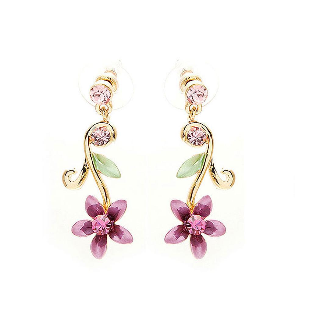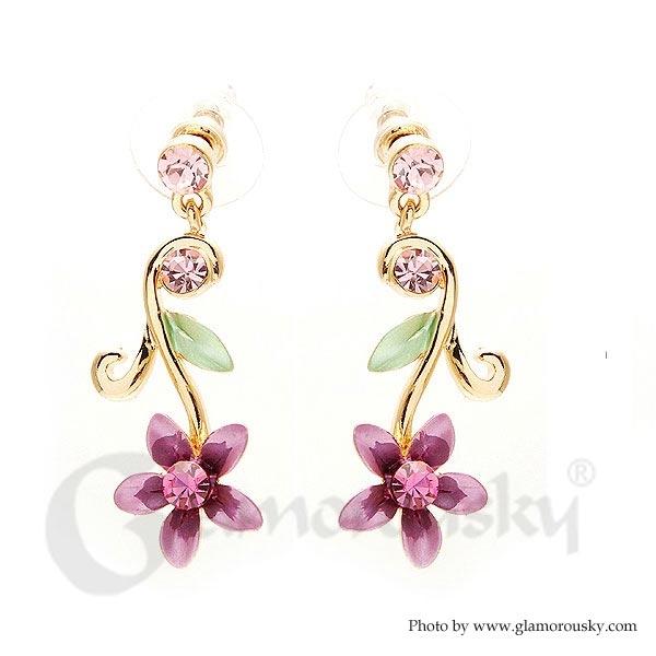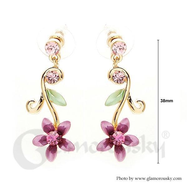 Purple Flower Golden Pair Earrings with Austrian Element Crystals