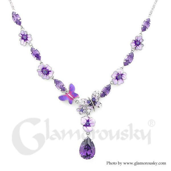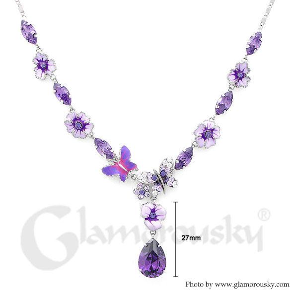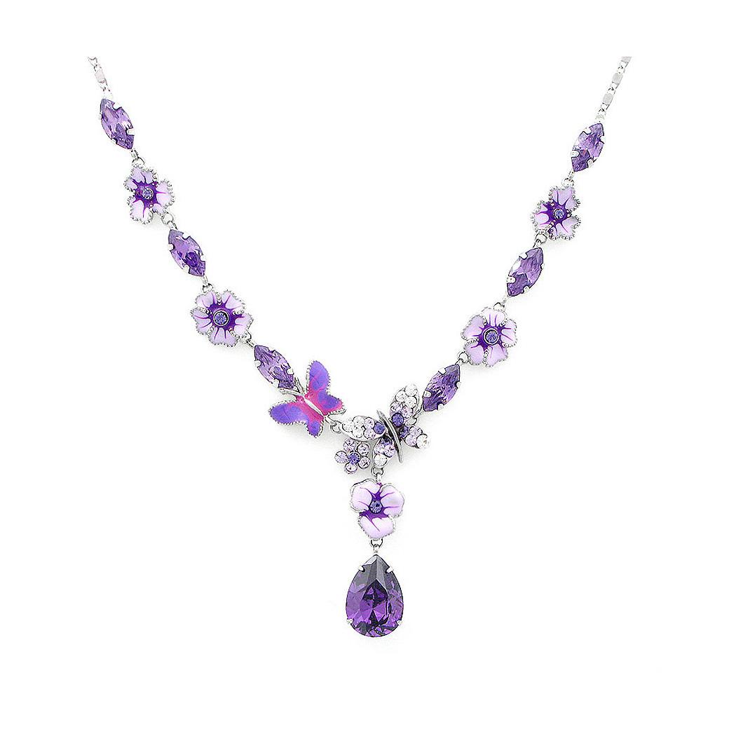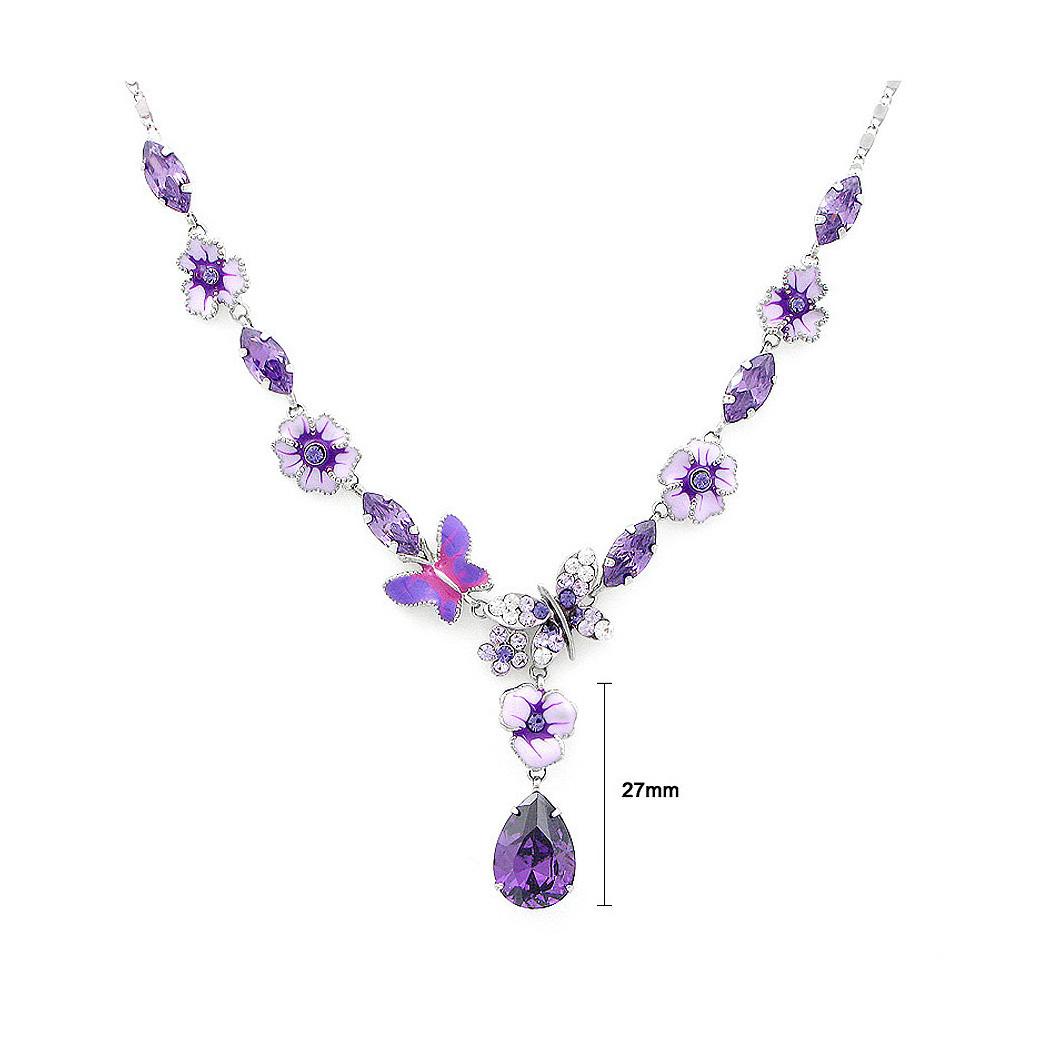 Purple Flower and Butterfly Necklace with Purple and Silver Austrian Element Crystals