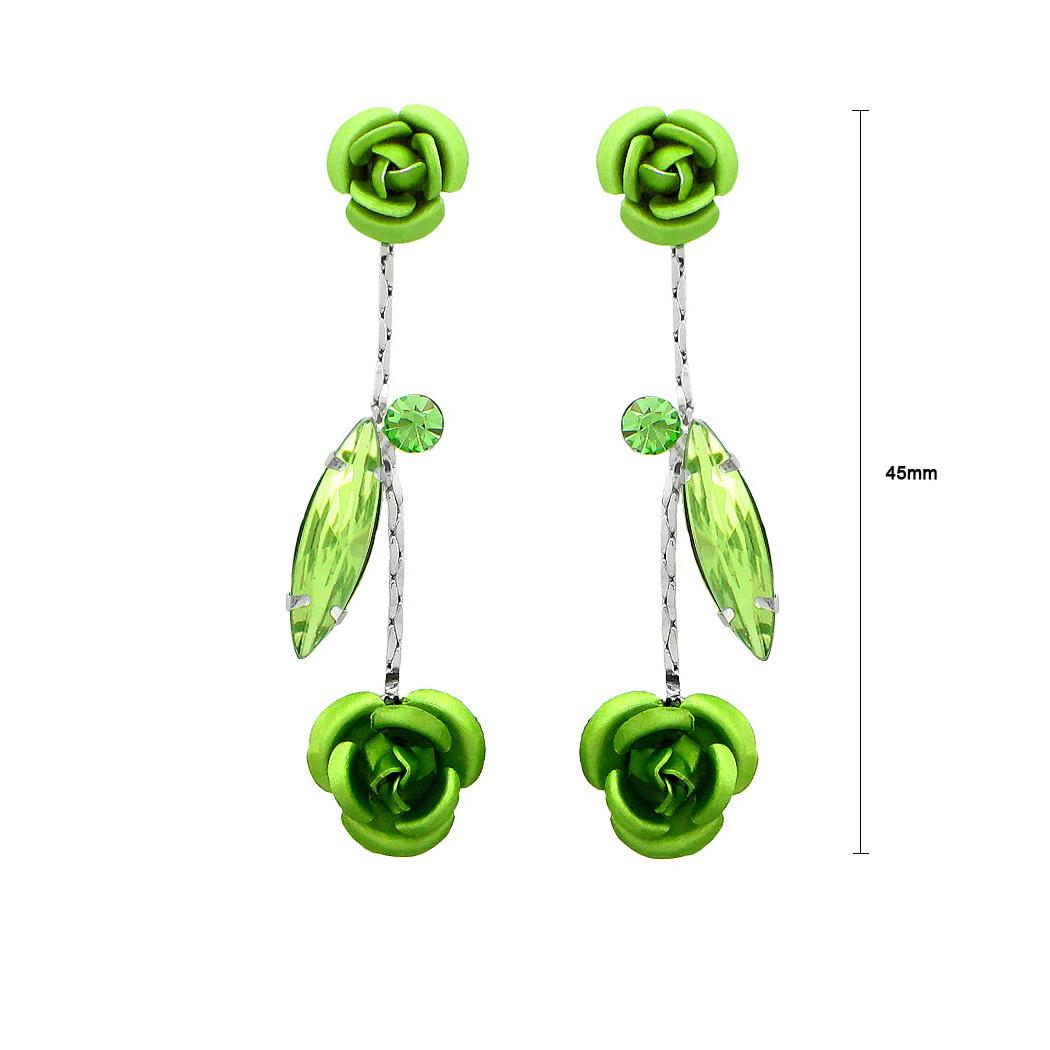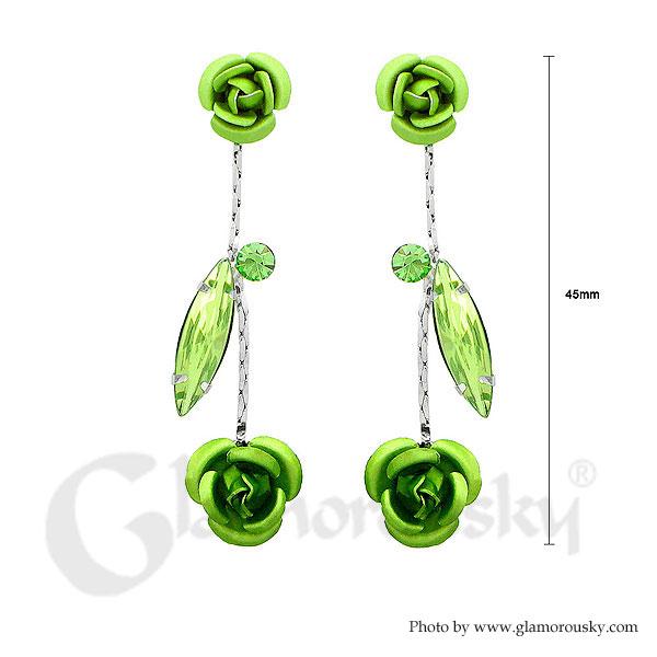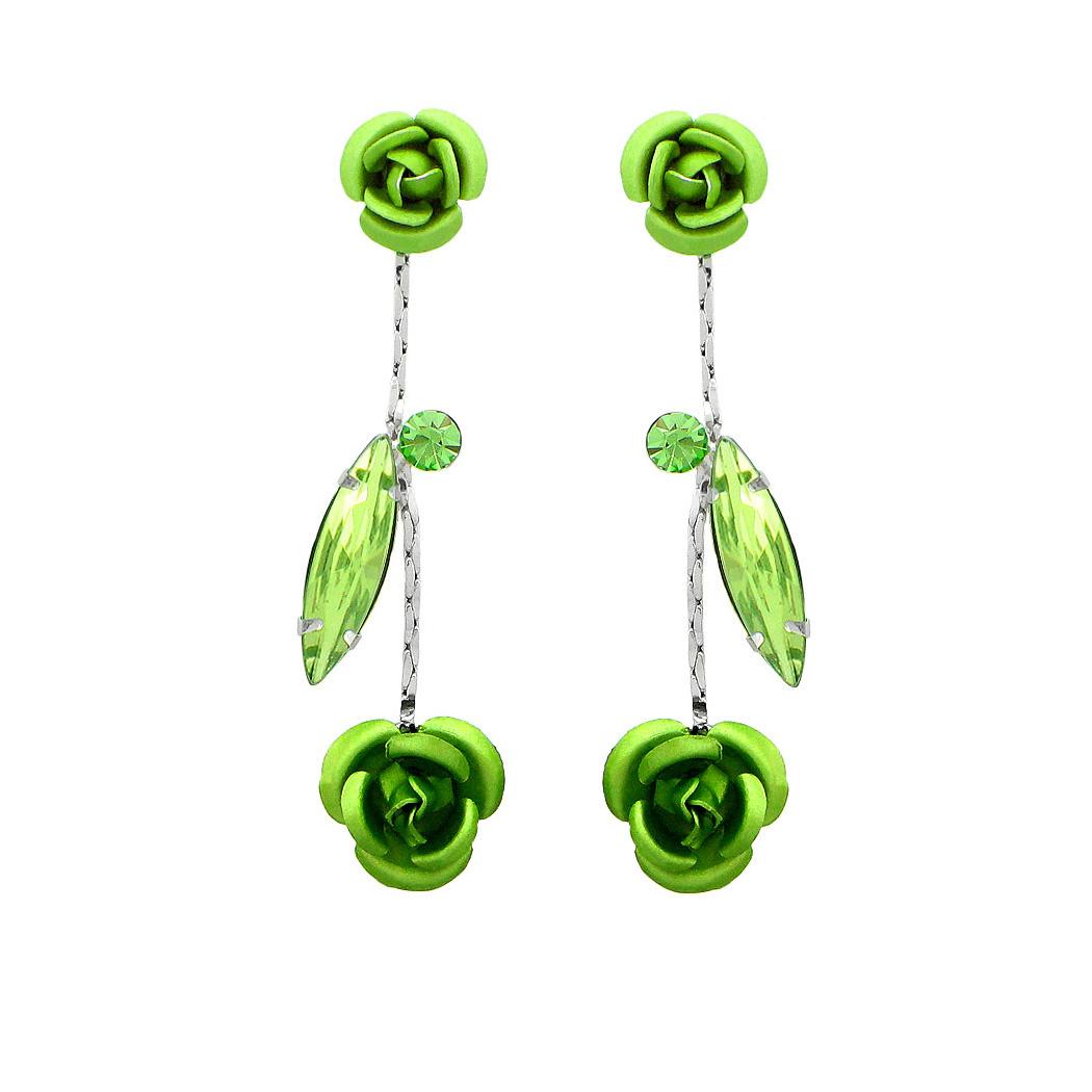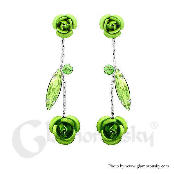 Leaves and Rose Earrings with Green Austrian Element Crystals