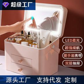 化妝品收納盒便攜源頭工廠桌面防塵家用帶led燈蓋鏡子口紅護膚品