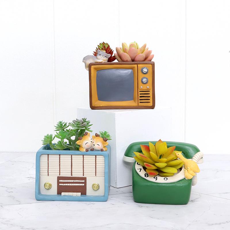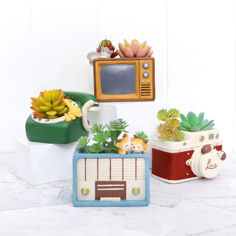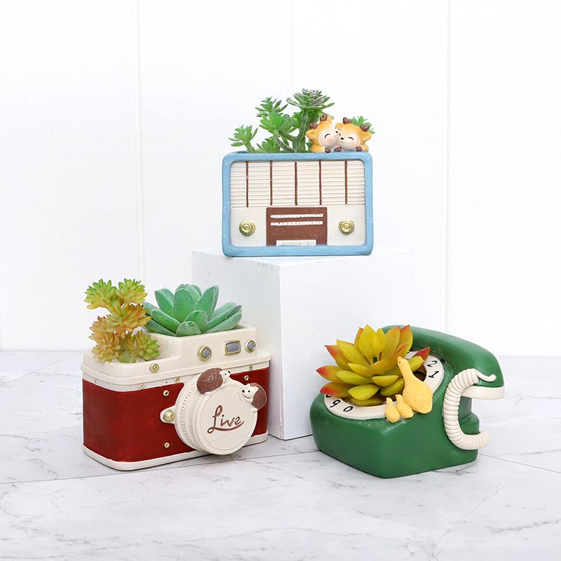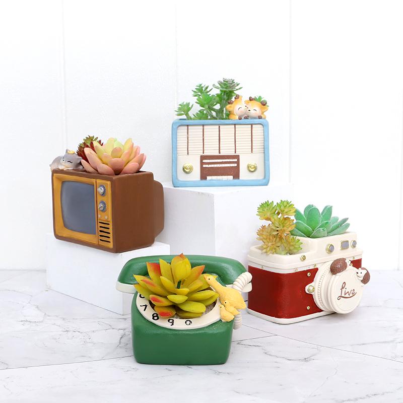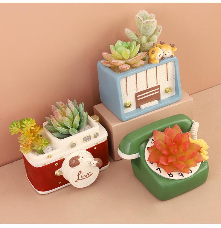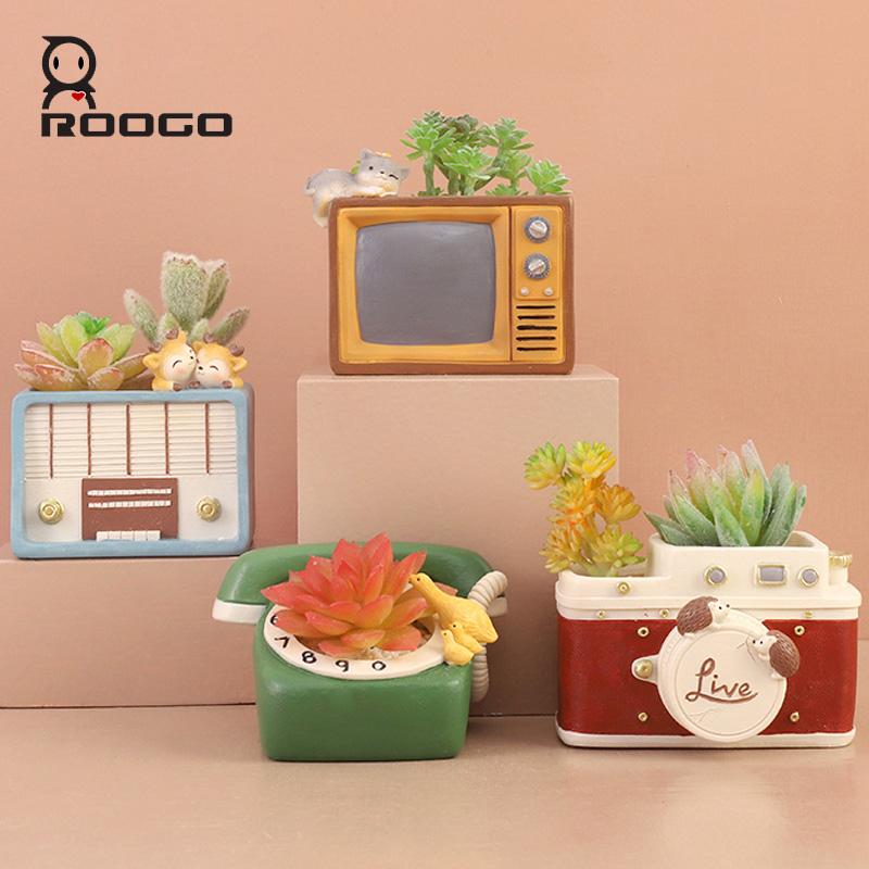 Specifications: Brand Name: Roogo Item Number: R7B2X0 Type: Flowerpot Material: Resin Style: retro Shape: telephone/camera/TV/radio Size: As shown Function: home garden decor/succulent pot/bonsai planter Tips: 1.Please allow 1-3mm differs due to manual measurement. 2.Due to the different monitor and light effect,the actual color maybe a slight different from the picture color.