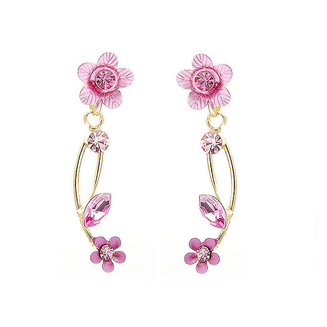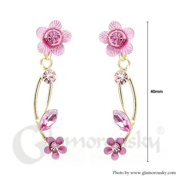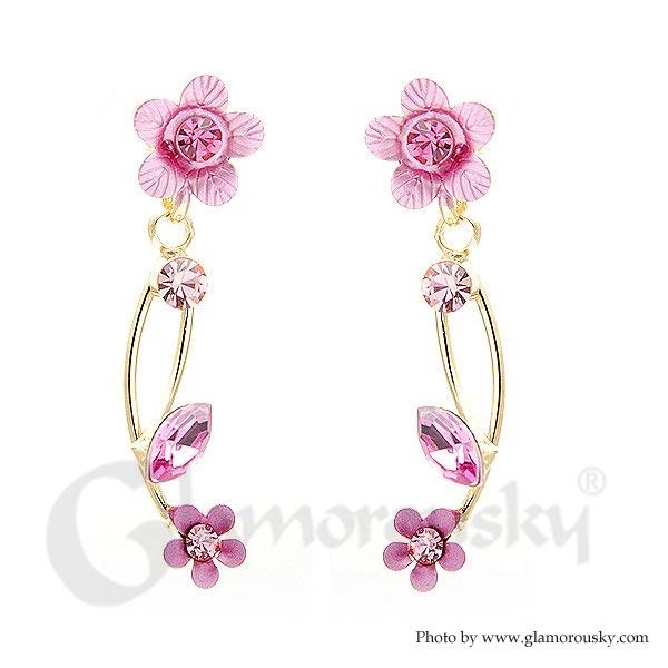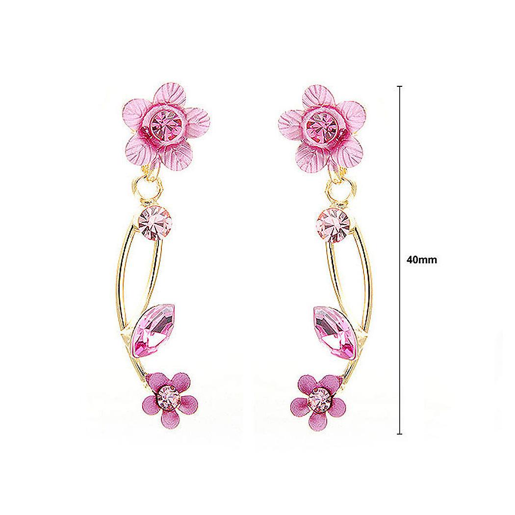Pink Flower Shape Golden Earrings with Pink Austrian Element Crystals