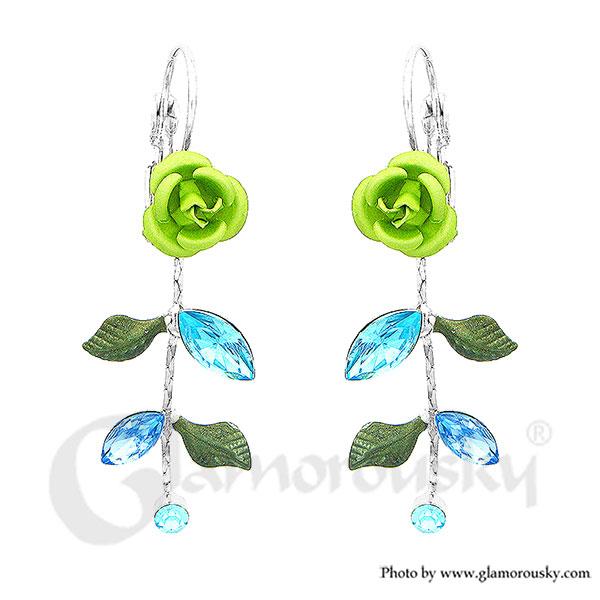 Green Rose Earrings with Blue Austrian Element Crystal and Crystal Glass