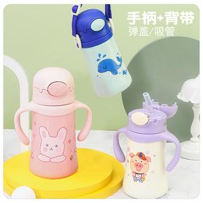 潮玩嬰兒學飲杯寶寶吸管杯喝奶杯 便攜帶手柄背帶水壺316保溫杯