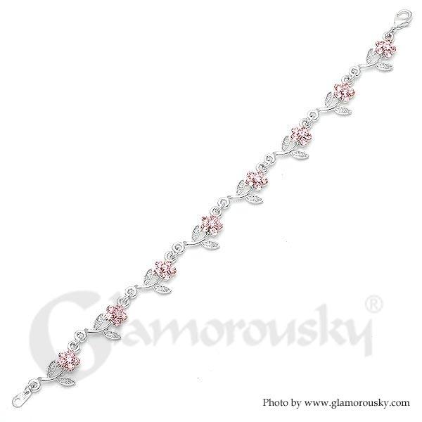 Leafy Flower Bracelet with Pink Austrian Element Crystals
