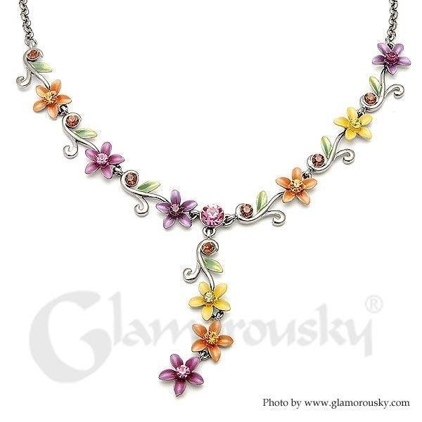 Orange Yellow and Purple Flowers Necklace with Austrian Element Crystals